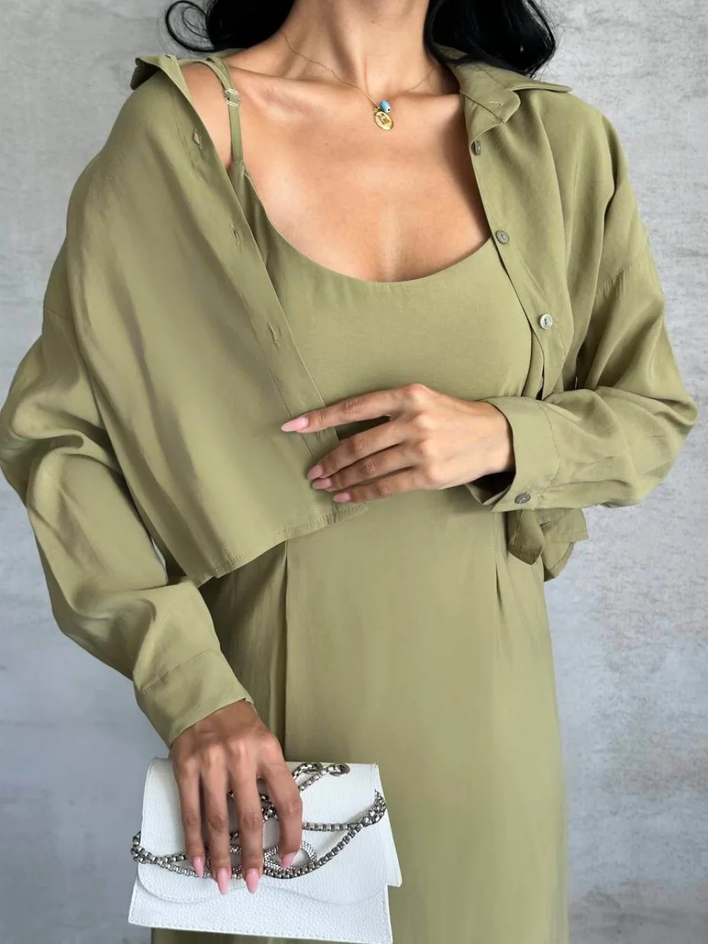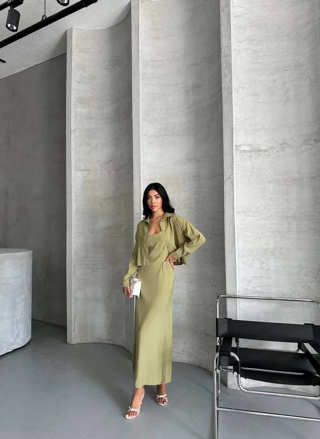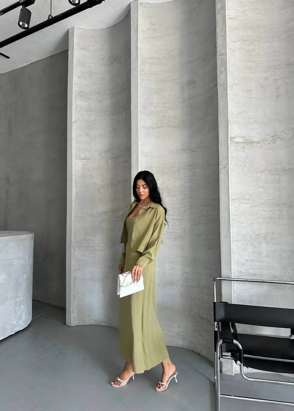 Zahmetsiz şıklığın anahtarı olan bu haki ikili takım, gardırobunuza modern bir dokunuş katıyor. Tek başına zarif bir askılı elbise ya da oversize kesim crop gömlek olarak da kullanabileceğiniz bu parçalar çok yönlü bir stil sunar. İster topuklu ayakkabılarla şık bir davete, ister sandaletlerle günlük bir buluşmaya uyarlayın. Bu gömlekli takım, her ortamda farkınızı ortaya koyacak.