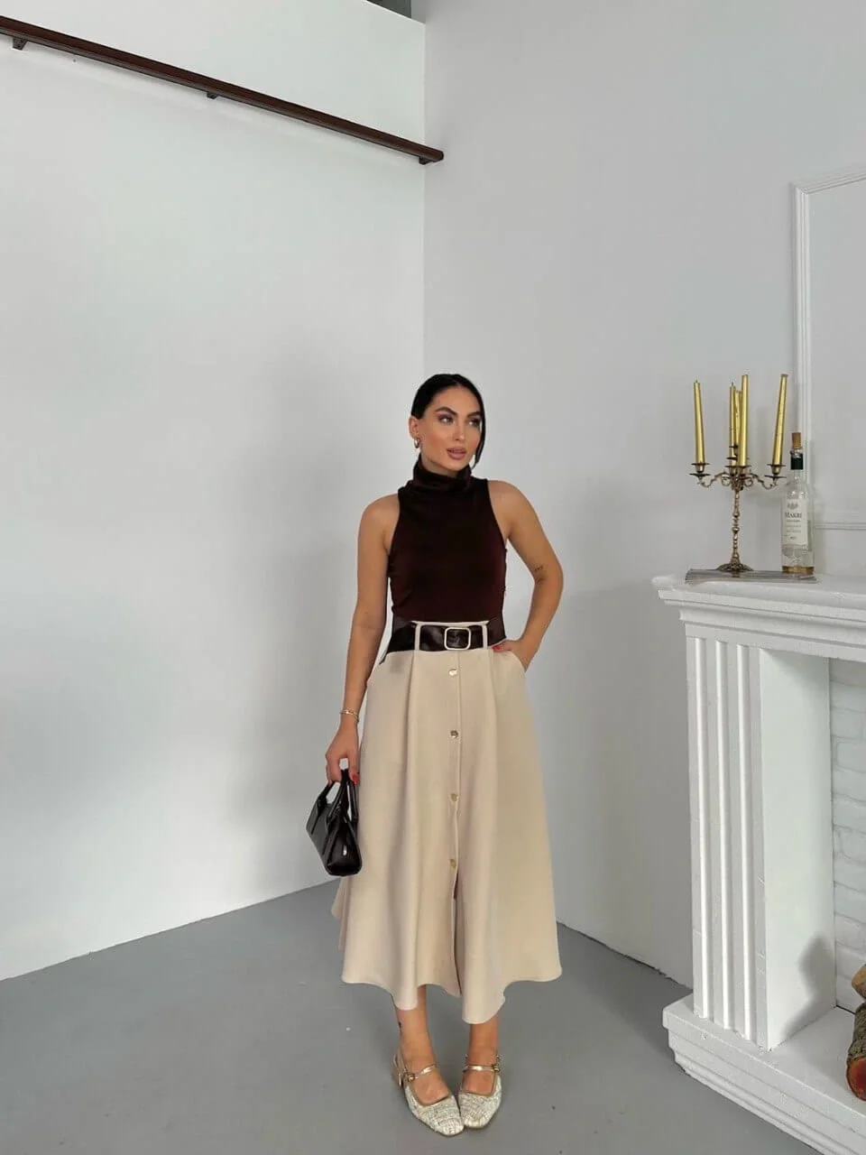 Kontrast Şıklığı: Kahverengi ve bejin sofistike uyumu, vücudu saran üst kısmın A kesim etekle oluşturduğu kontrast, zarif ve dengeli bir silüet yaratır.