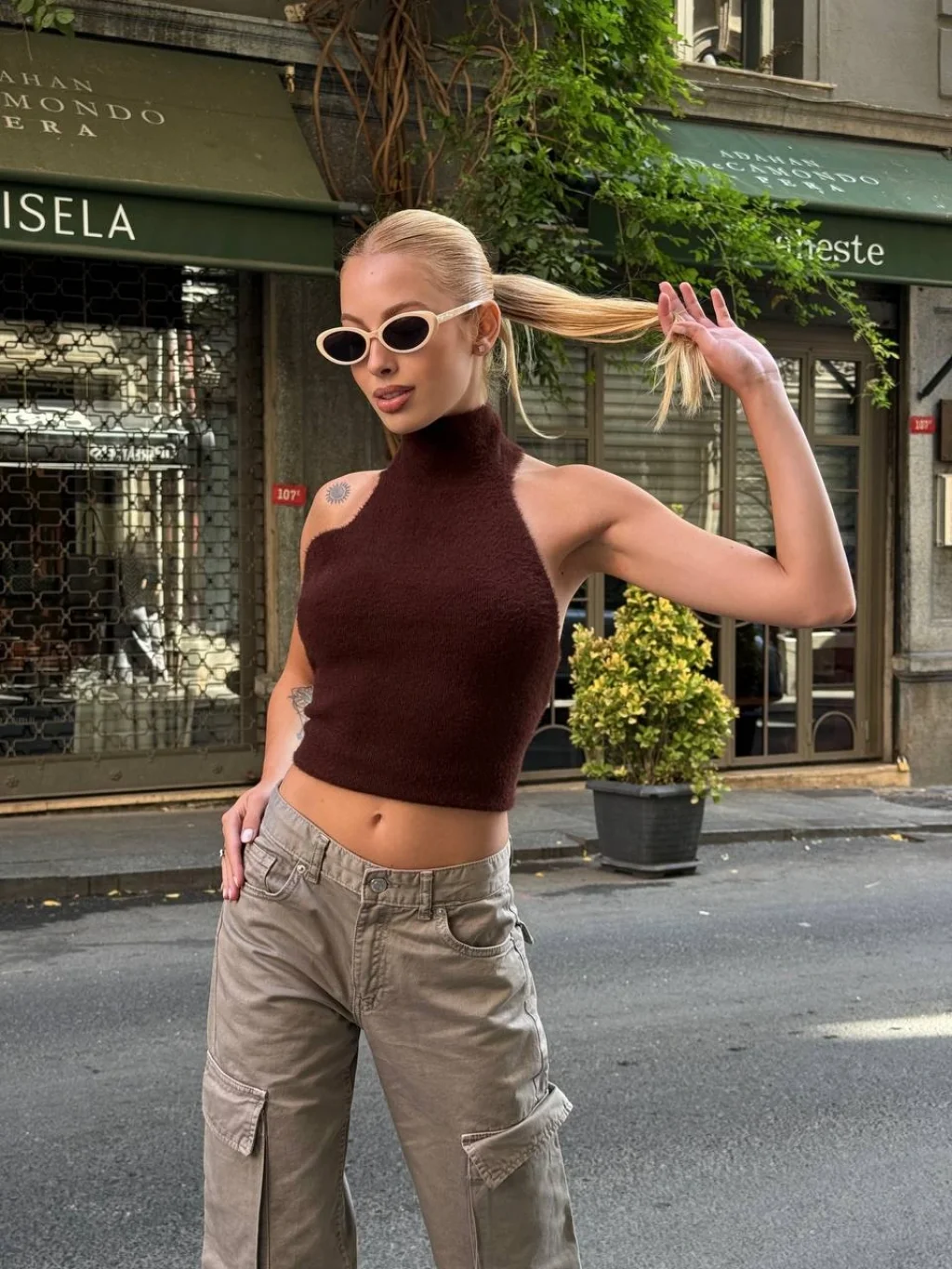 Bu kahverengi triko bluz, her kombine iddia katmak için idealdir. Onu yüksek bel pileli bir etek, deri bir pantolon veya saten bir etekle tamamlayarak şık bir gece görünümü elde edebilirsiniz. Yüksek bel jean'lerle kombinleyerek gündüzden akşama uzanan zahmetsiz bir stil de yaratabilirsiniz.