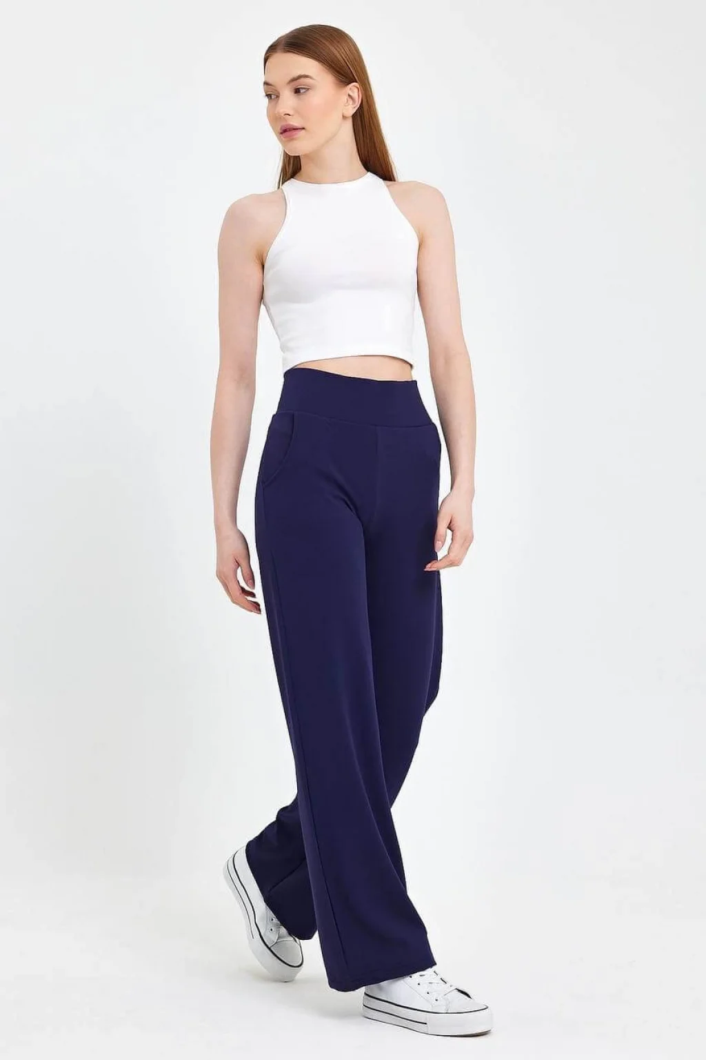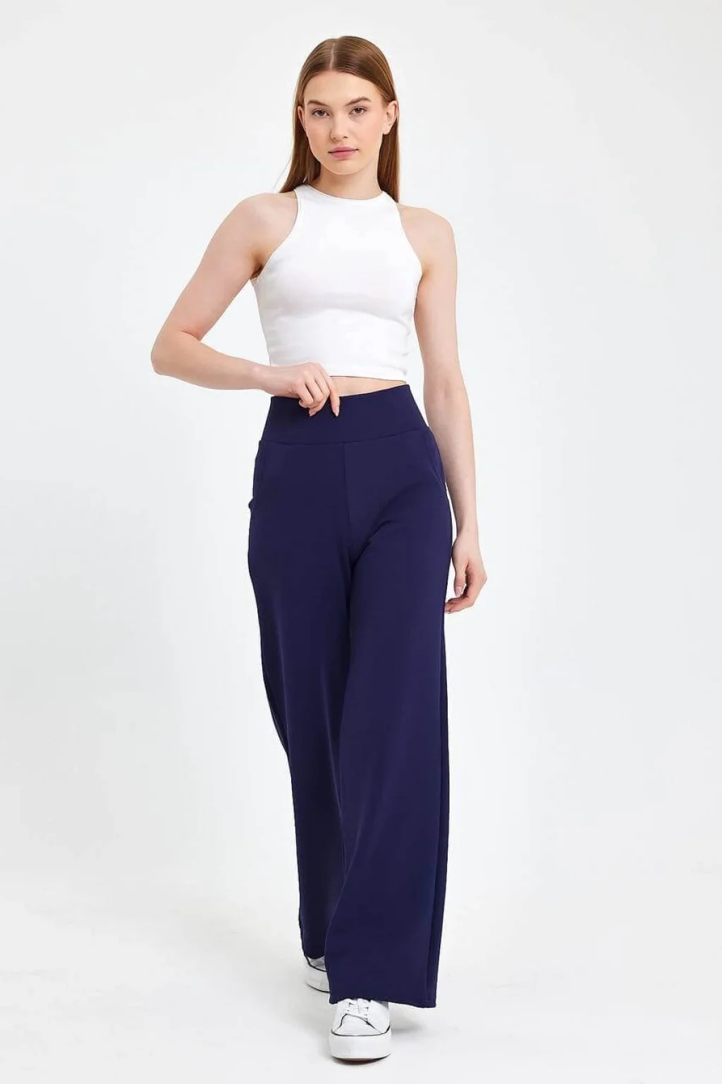Gardırobunuzun joker parçası olacak bu lacivert palazzo pantolon, sayısız görünümün kapısını aralar. Onu basic bir crop top ve sneaker'larla kombinleyerek sportif bir şıklık, şık bir bluz veya gömlekle tamamlayarak ise ofis stilinize taşıyabilirsiniz. Yüksek bel geniş paça pantolon, her ortamda zahmetsiz zarafet vaat ediyor.