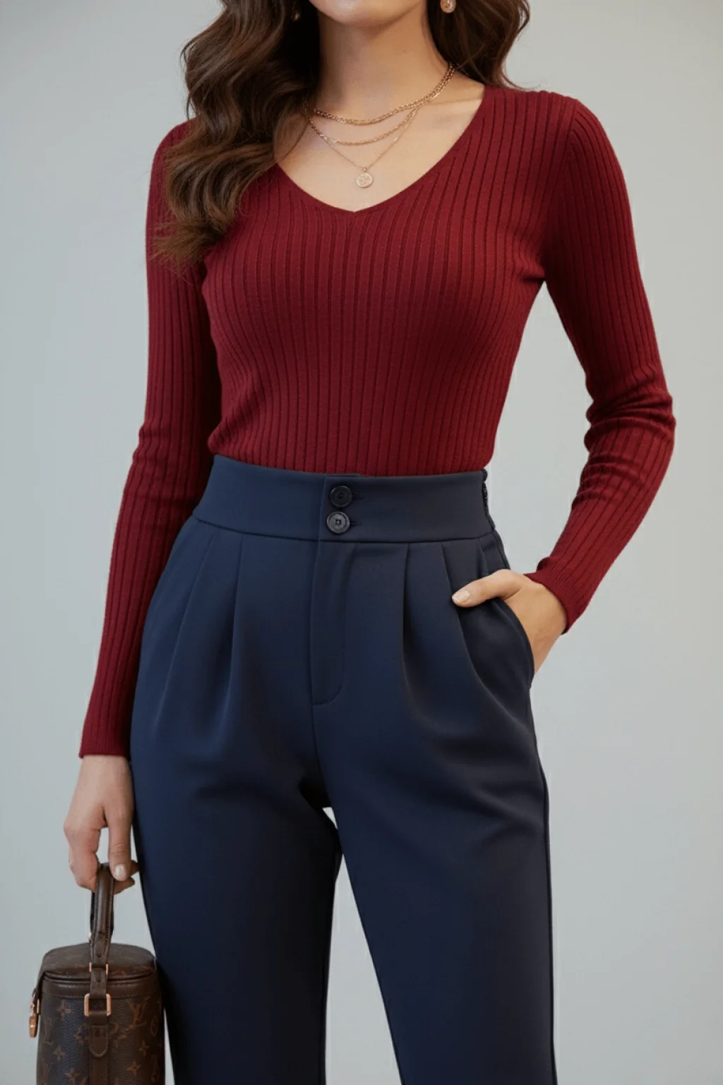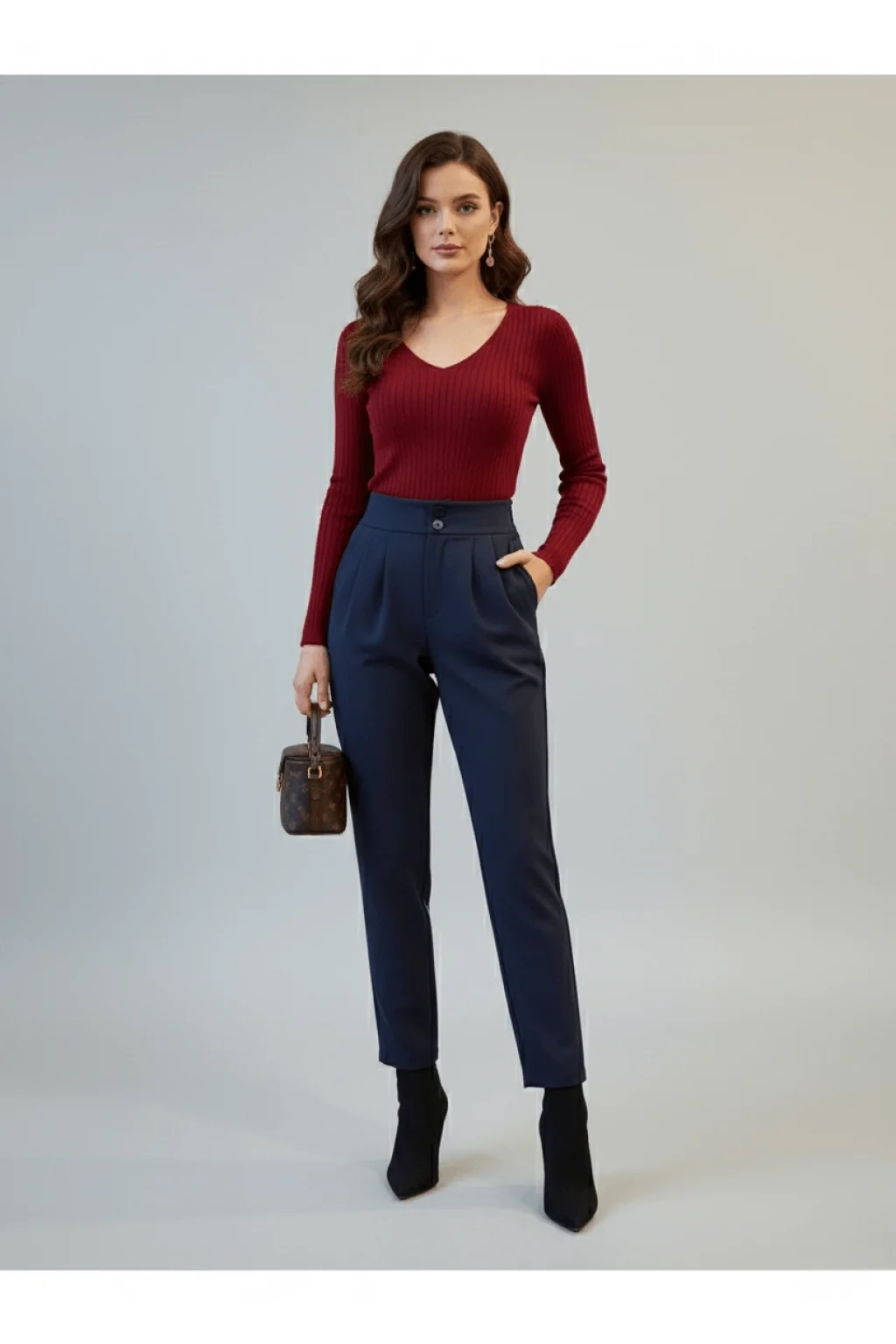 MetuCa Kadın Lacivert Yüksek Bel Çift Düğmeli Pensli Havuç Kesim Esnek Krep Pantolon