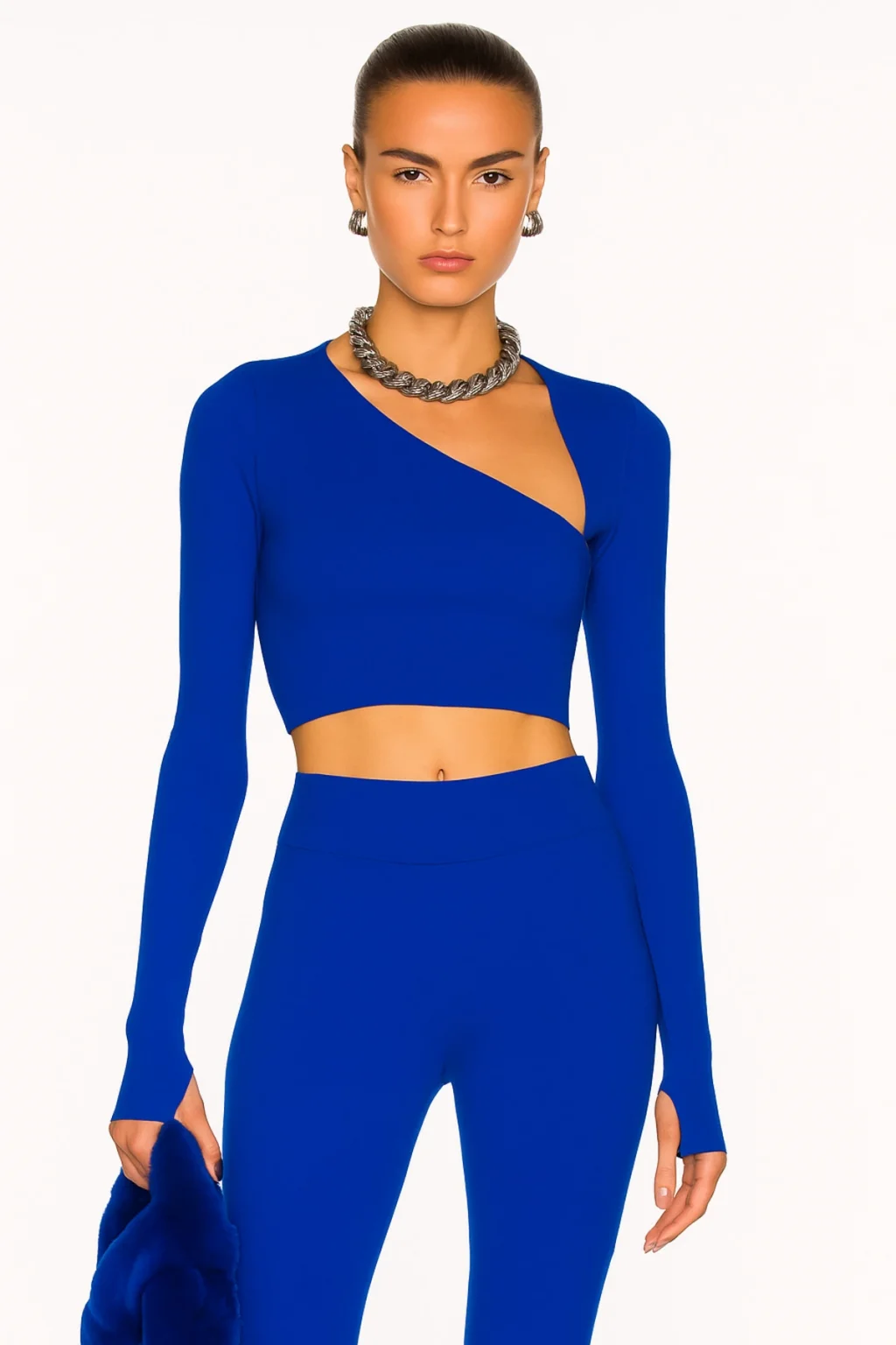 Görünümünüze anında iddialı bir hava katacak bu mavi asimetrik crop bluz, gardırobunuzun en özel parçalarından biri olacak. Parmak geçmeli detayıyla fark yaratan bu üstü, yüksek bel deri pantolonlar, mini etekler veya bol paça kumaş pantolonlarla kombinleyerek gece şıklığınızı tamamlayabilirsiniz.