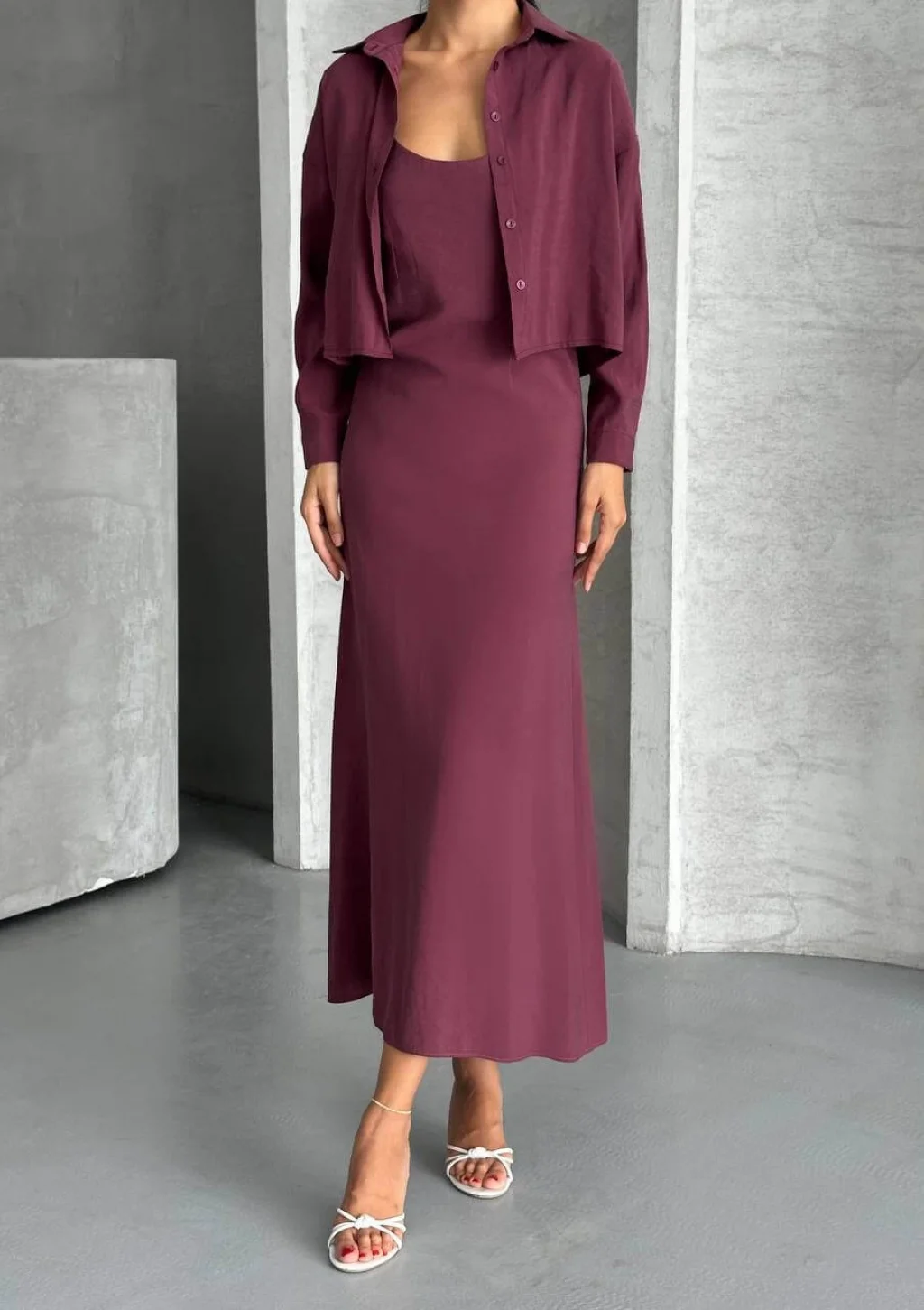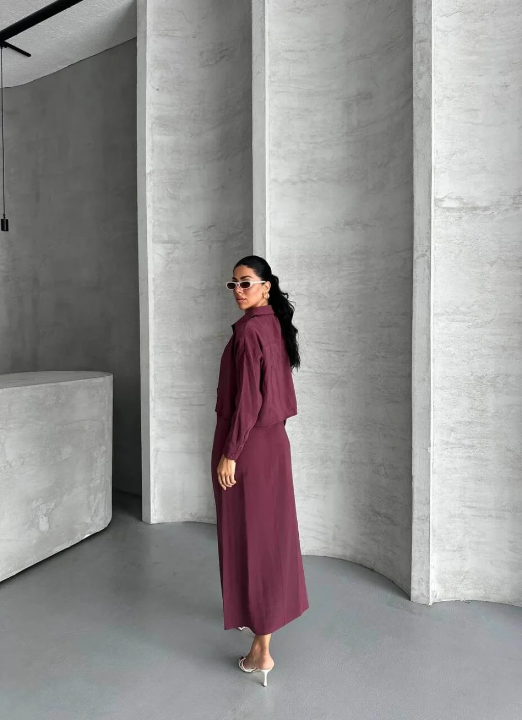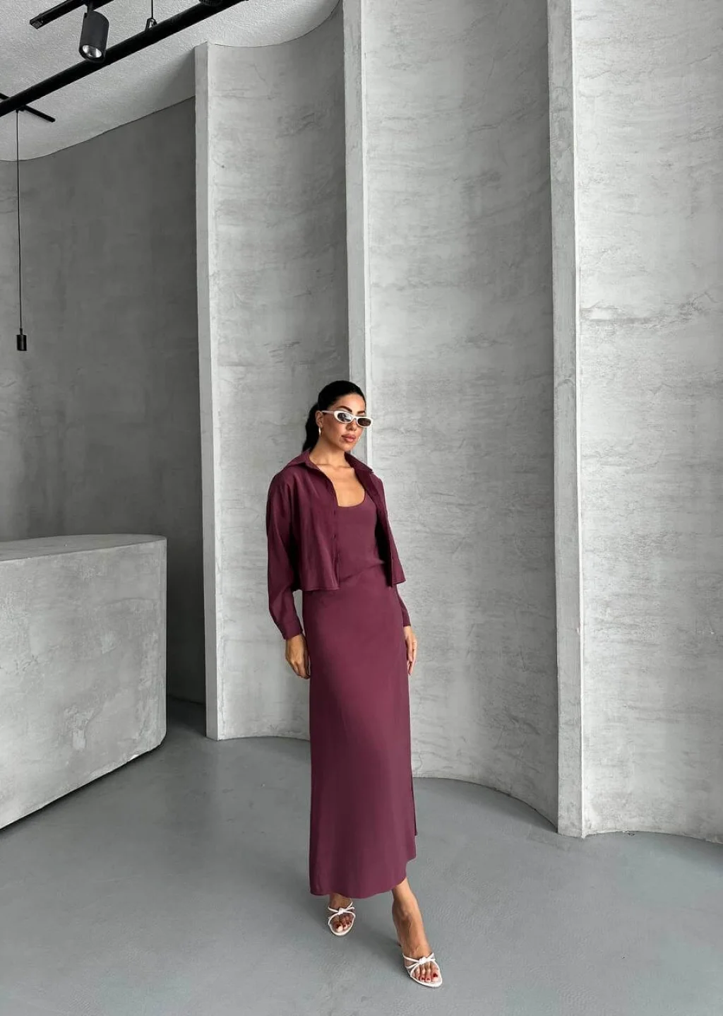 Zahmetsiz şıklığın anahtarı olan bu mürdüm ikili takım, gardırobunuza modern bir dokunuş katıyor. Tek başına zarif bir askılı elbise ya da oversize kesim crop gömlek olarak da kullanabileceğiniz bu parçalar çok yönlü bir stil sunar. İster topuklu ayakkabılarla şık bir davete, ister sandaletlerle günlük bir buluşmaya uyarlayın. Bu gömlekli takım, her ortamda farkınızı ortaya koyacak.