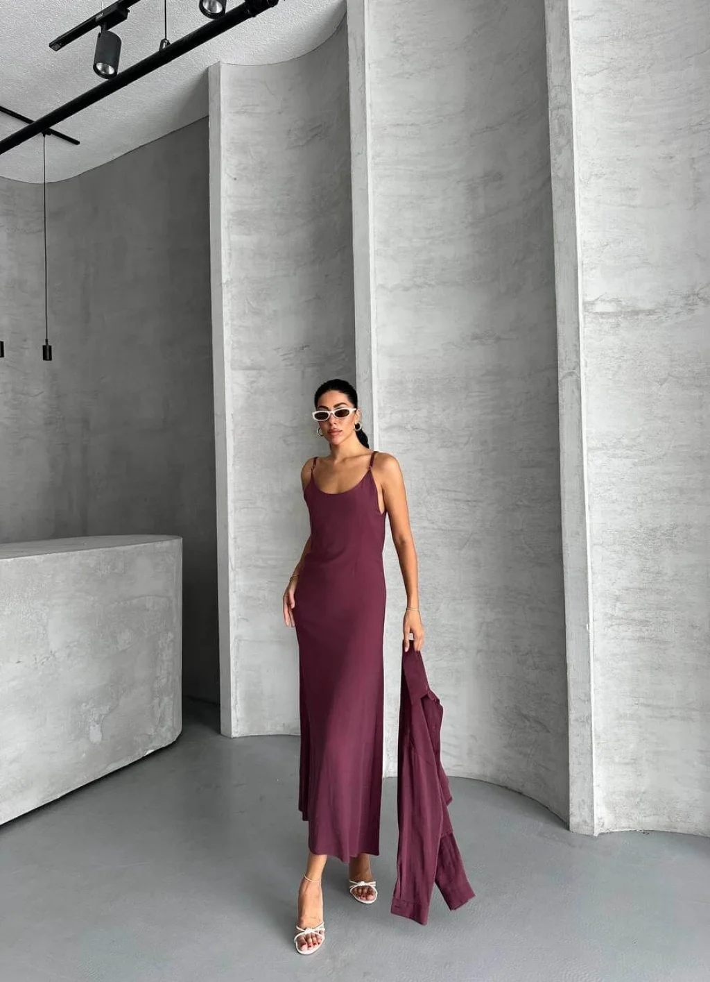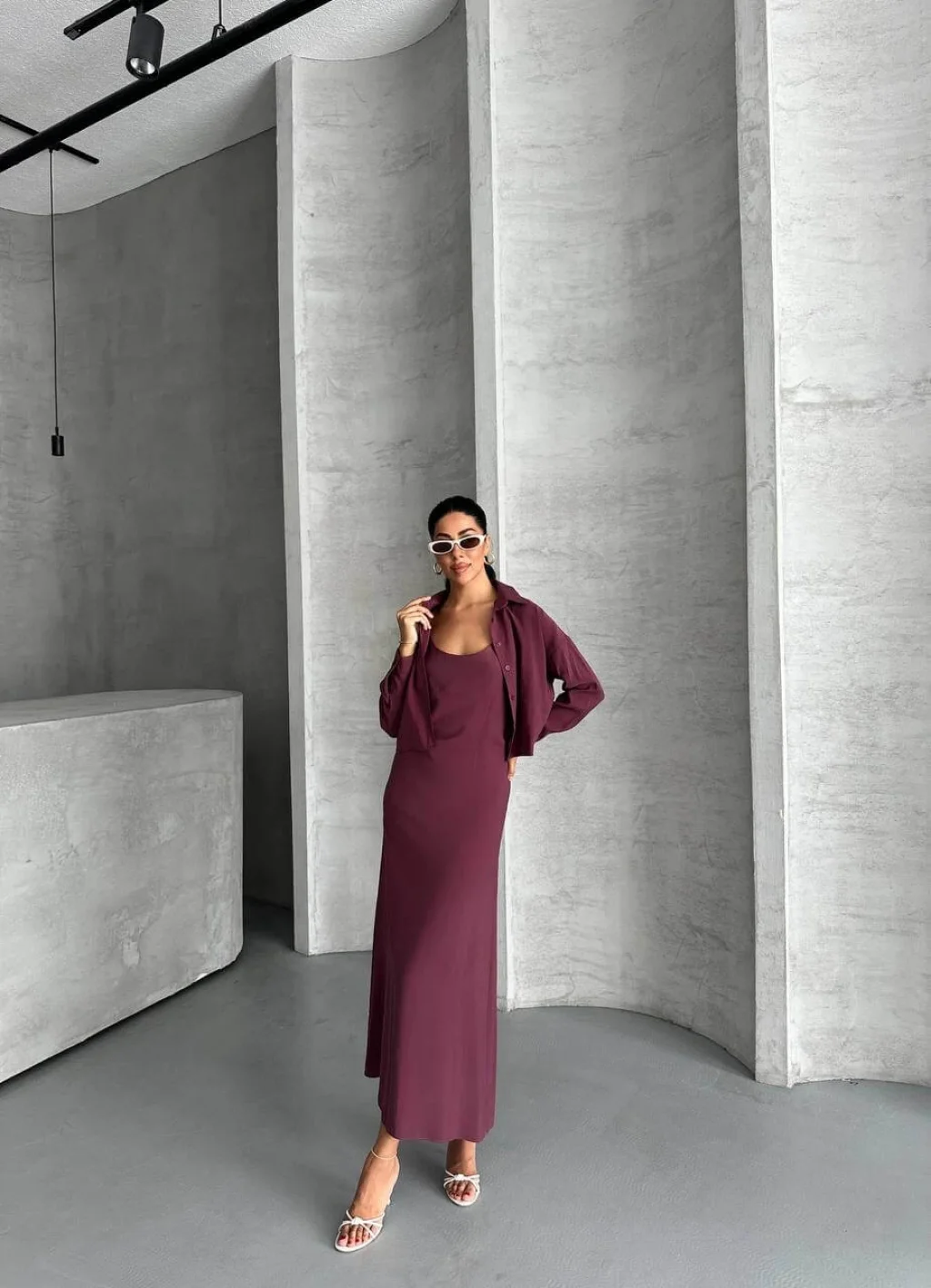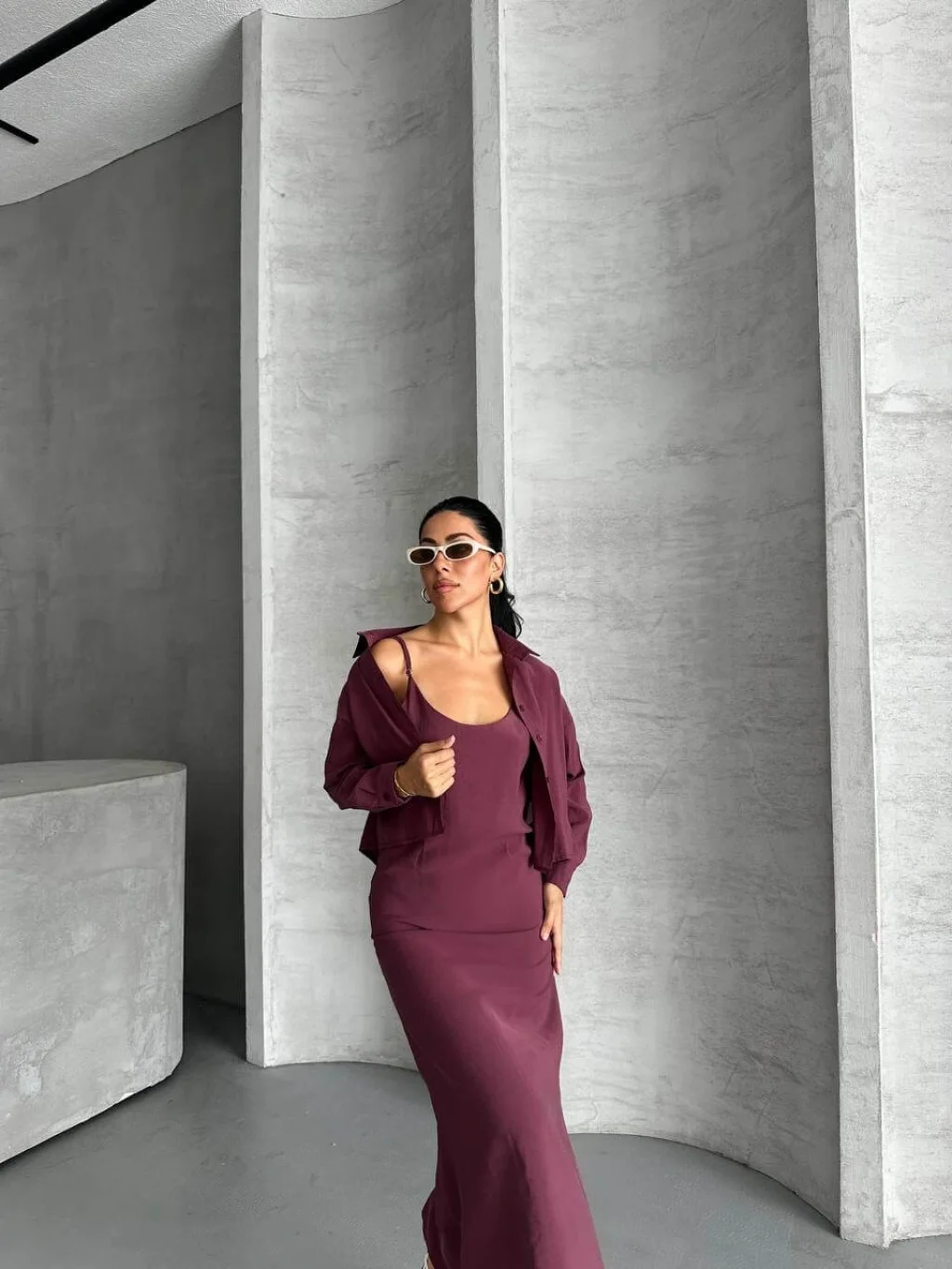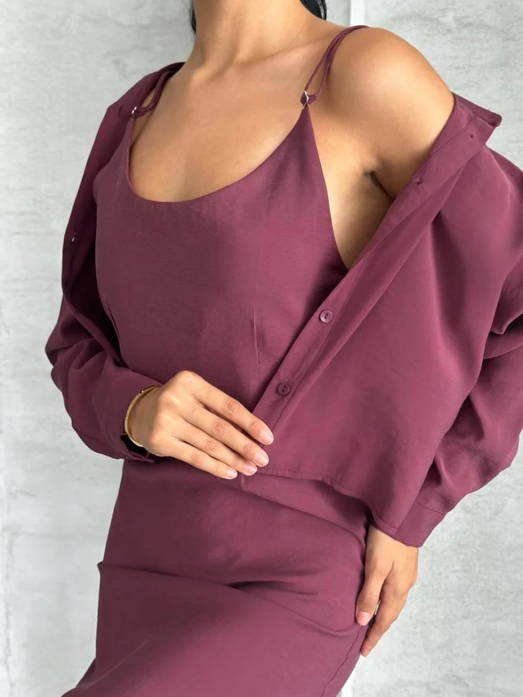 Zahmetsiz şıklığın anahtarı olan bu mürdüm ikili takım, gardırobunuza modern bir dokunuş katıyor. Tek başına zarif bir askılı elbise ya da oversize kesim crop gömlek olarak da kullanabileceğiniz bu parçalar çok yönlü bir stil sunar. İster topuklu ayakkabılarla şık bir davete, ister sandaletlerle günlük bir buluşmaya uyarlayın. Bu gömlekli takım, her ortamda farkınızı ortaya koyacak.