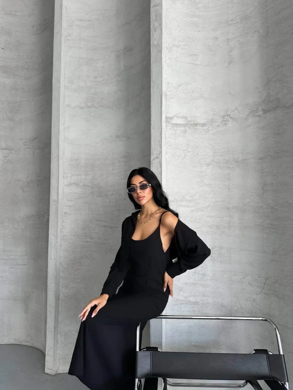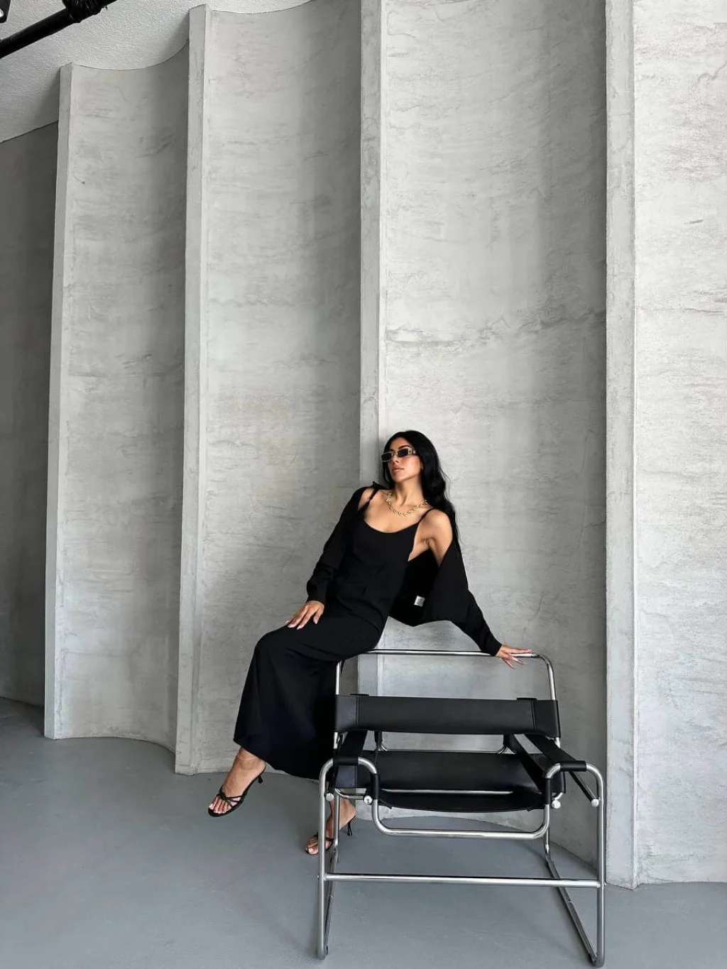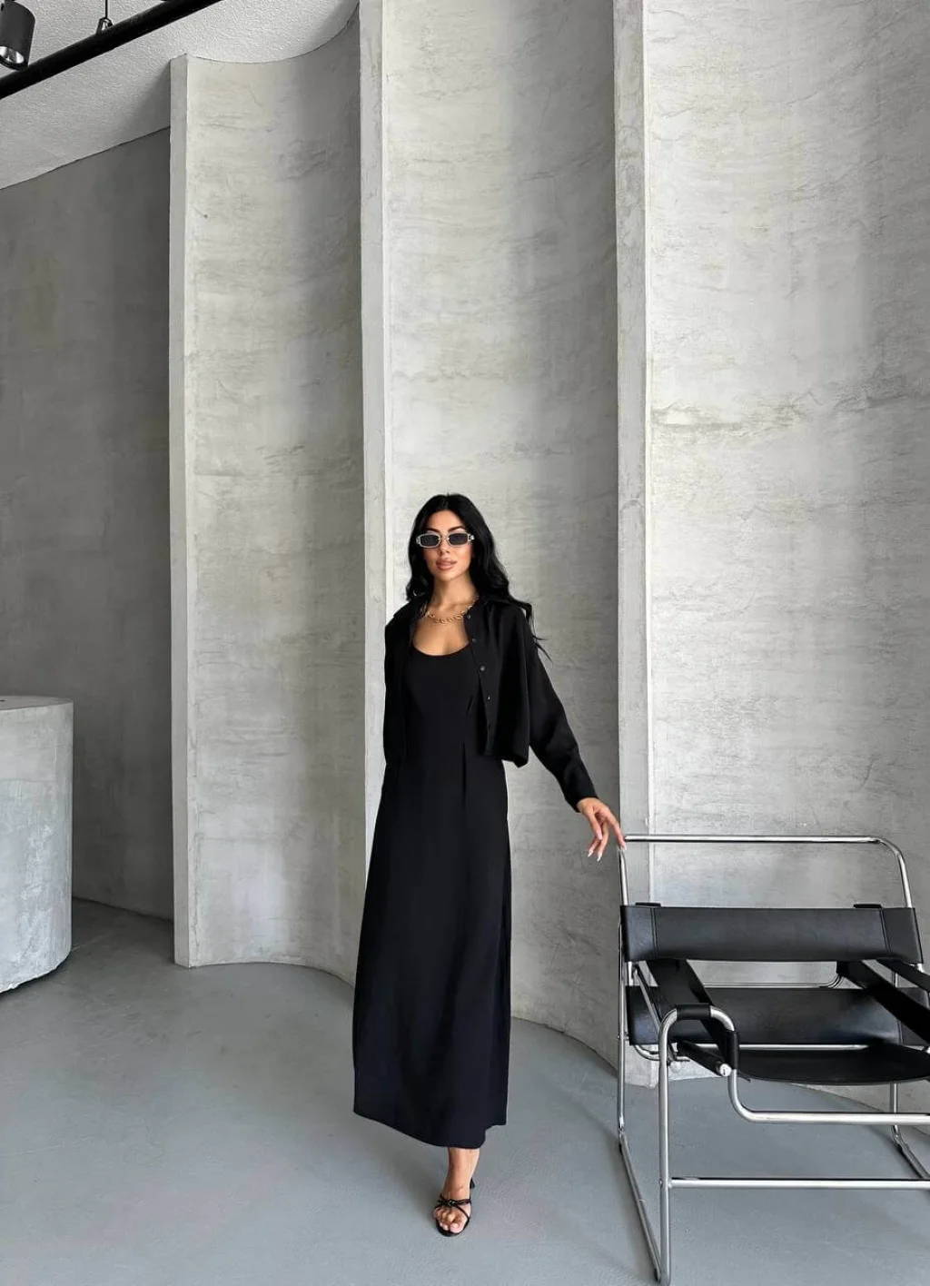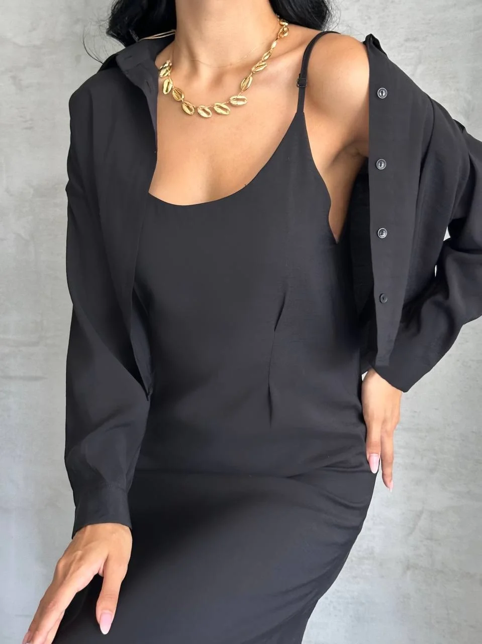 Zahmetsiz şıklığın anahtarı olan bu siyah ikili takım, gardırobunuza modern bir dokunuş katıyor. Tek başına zarif bir askılı elbise ya da oversize kesim crop gömlek olarak da kullanabileceğiniz bu parçalar çok yönlü bir stil sunar. İster topuklu ayakkabılarla şık bir davete, ister sandaletlerle günlük bir buluşmaya uyarlayın. Bu gömlekli takım, her ortamda farkınızı ortaya koyacak.