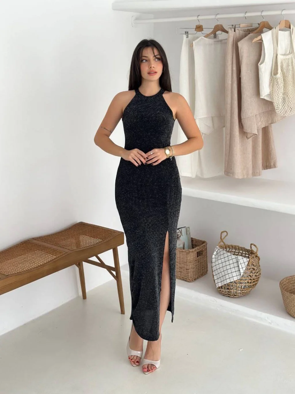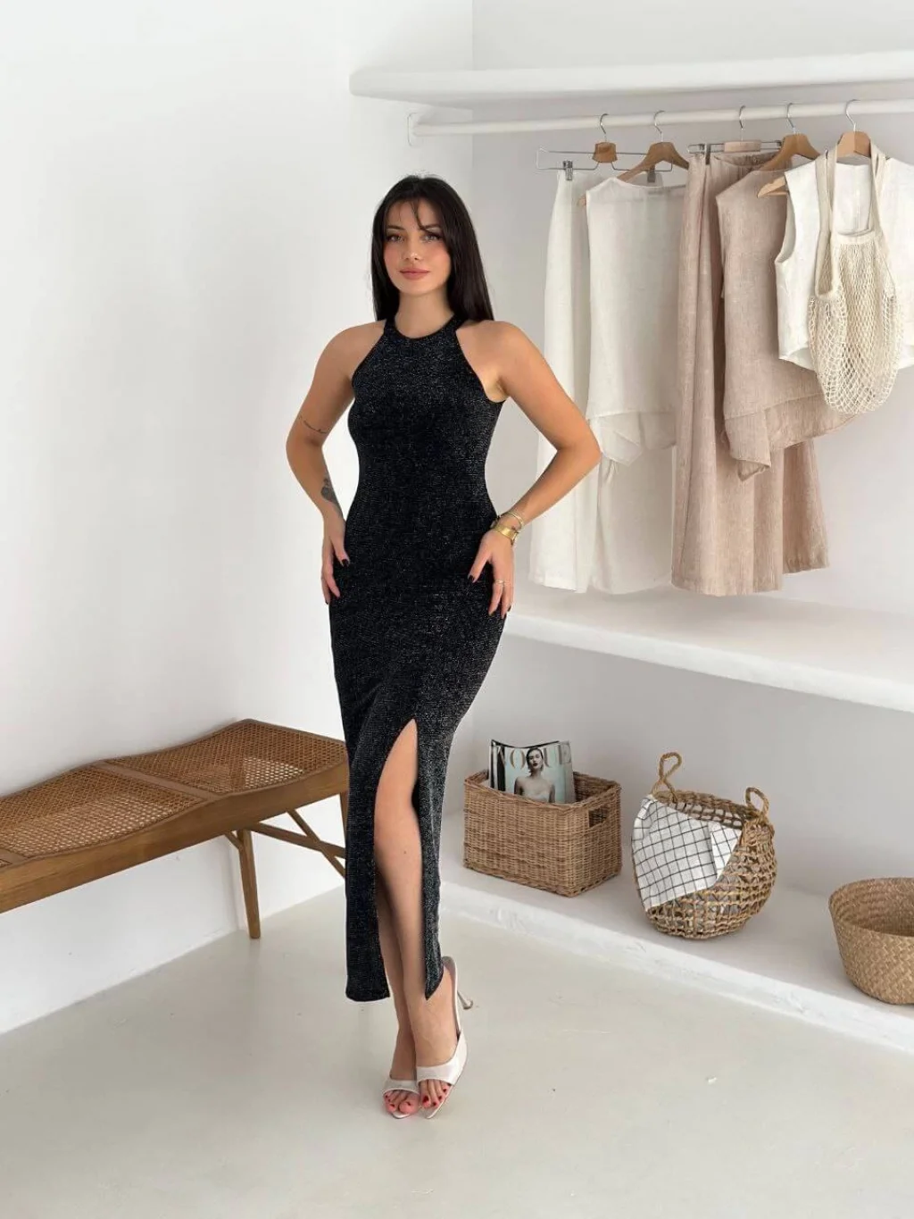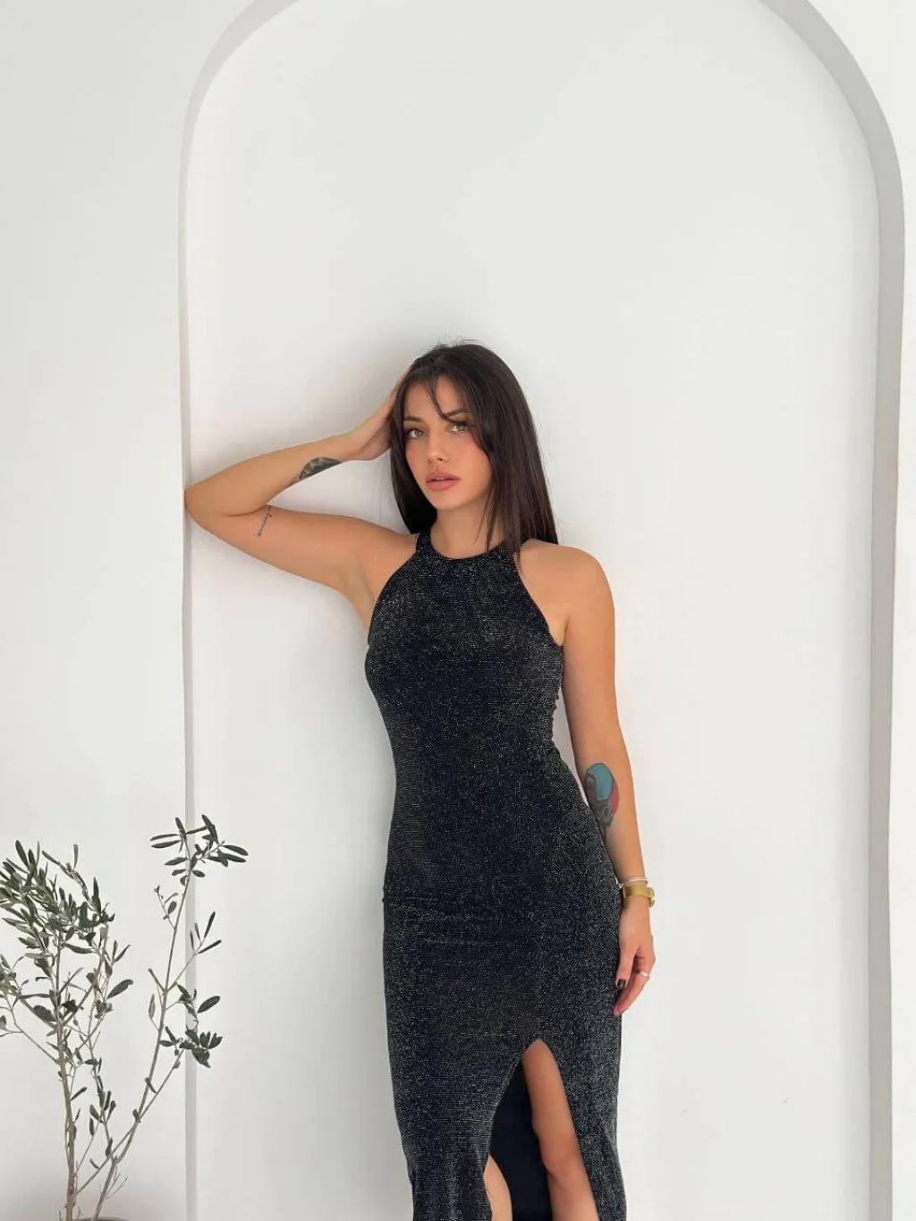 Gecenin yıldızı olmaya hazır mısınız? Bu siyah simli elbise, tüm özel davetleriniz için mükemmel bir seçim. Halter yaka kesimi ve derin yırtmaç detayıyla baş döndüren bu elbiseyi, ince bantlı bir stiletto ve şık bir clutch ile tamamlayarak unutulmaz bir görünüme imza atın.