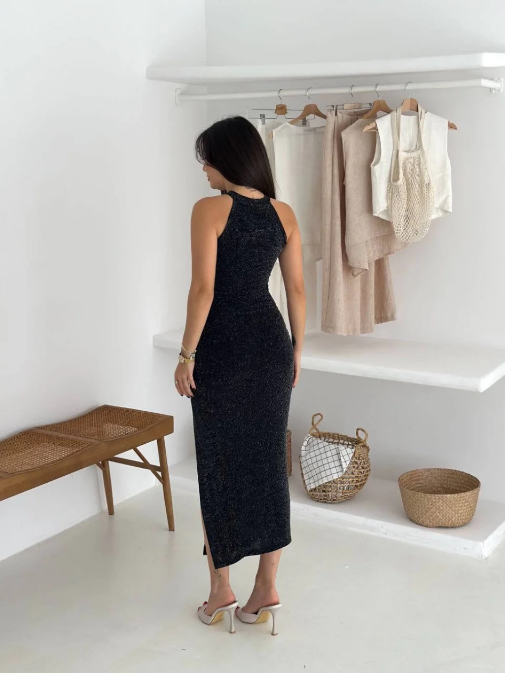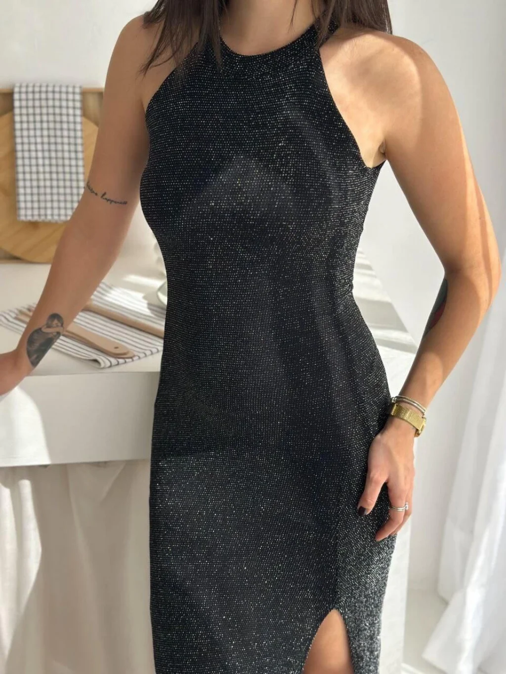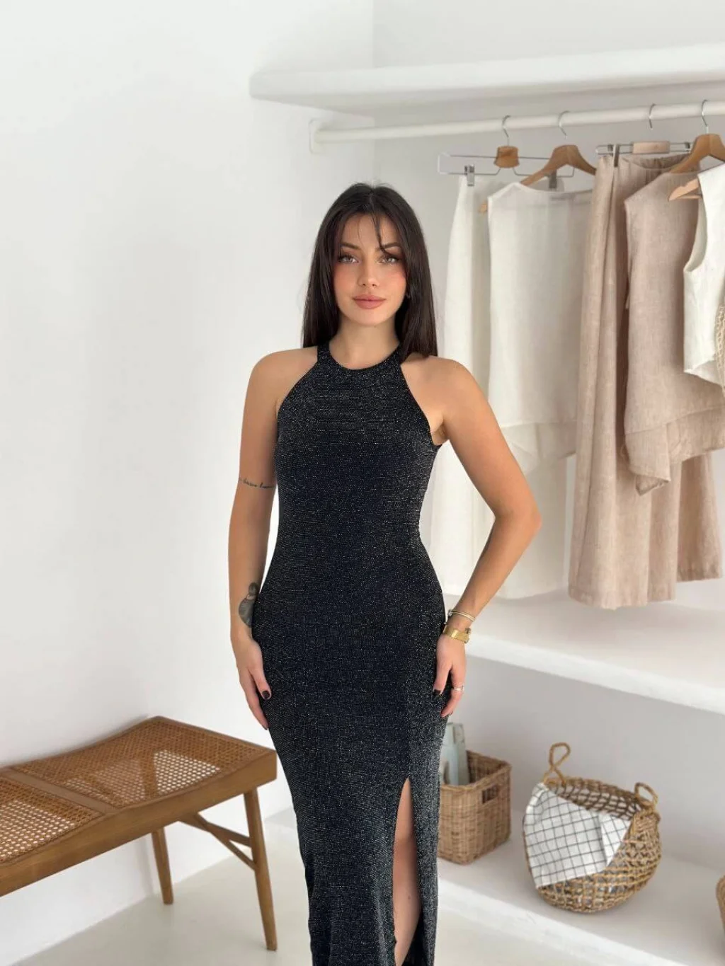 Gecenin yıldızı olmaya hazır mısınız? Bu siyah simli elbise, tüm özel davetleriniz için mükemmel bir seçim. Halter yaka kesimi ve derin yırtmaç detayıyla baş döndüren bu elbiseyi, ince bantlı bir stiletto ve şık bir clutch ile tamamlayarak unutulmaz bir görünüme imza atın.