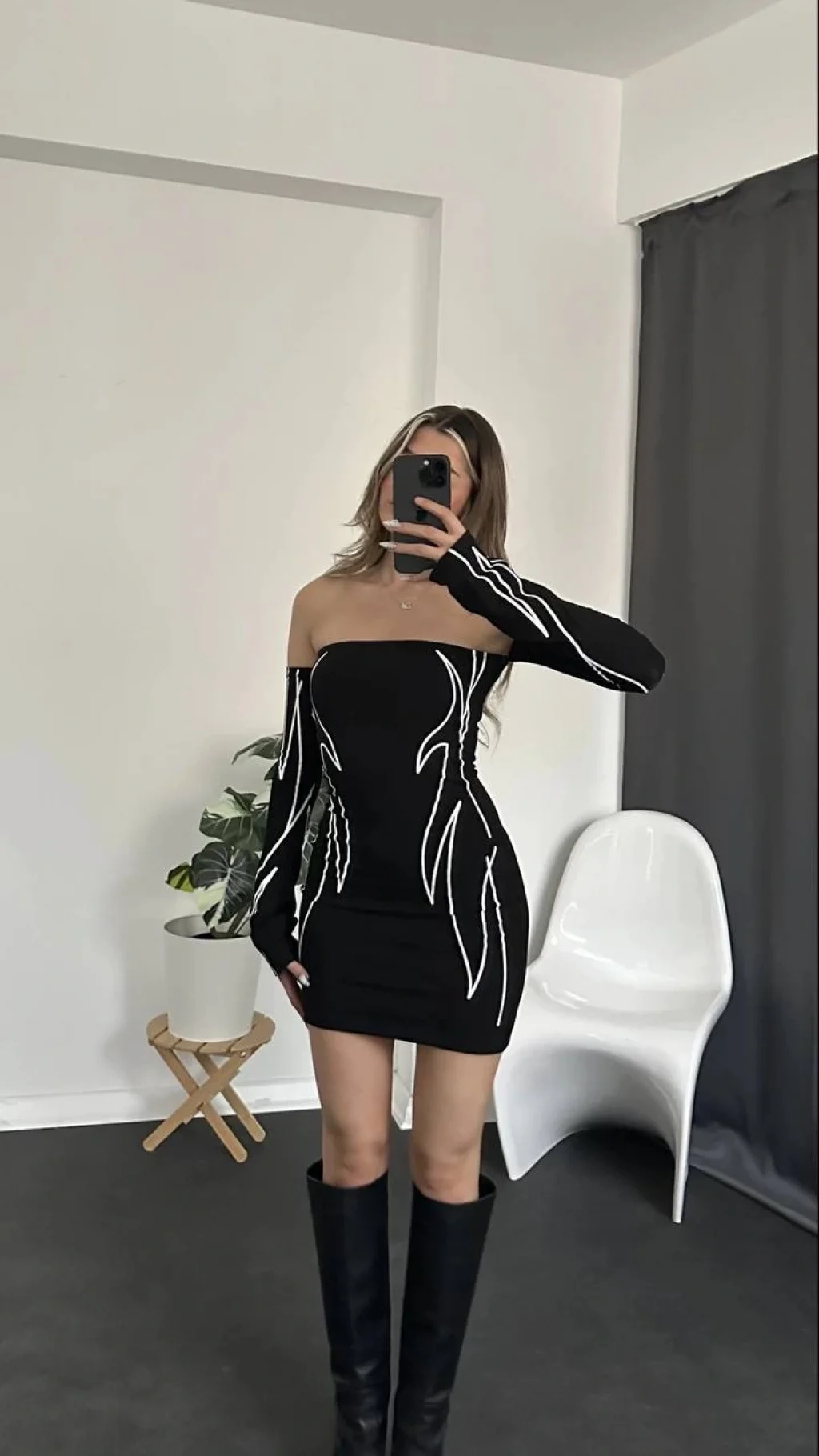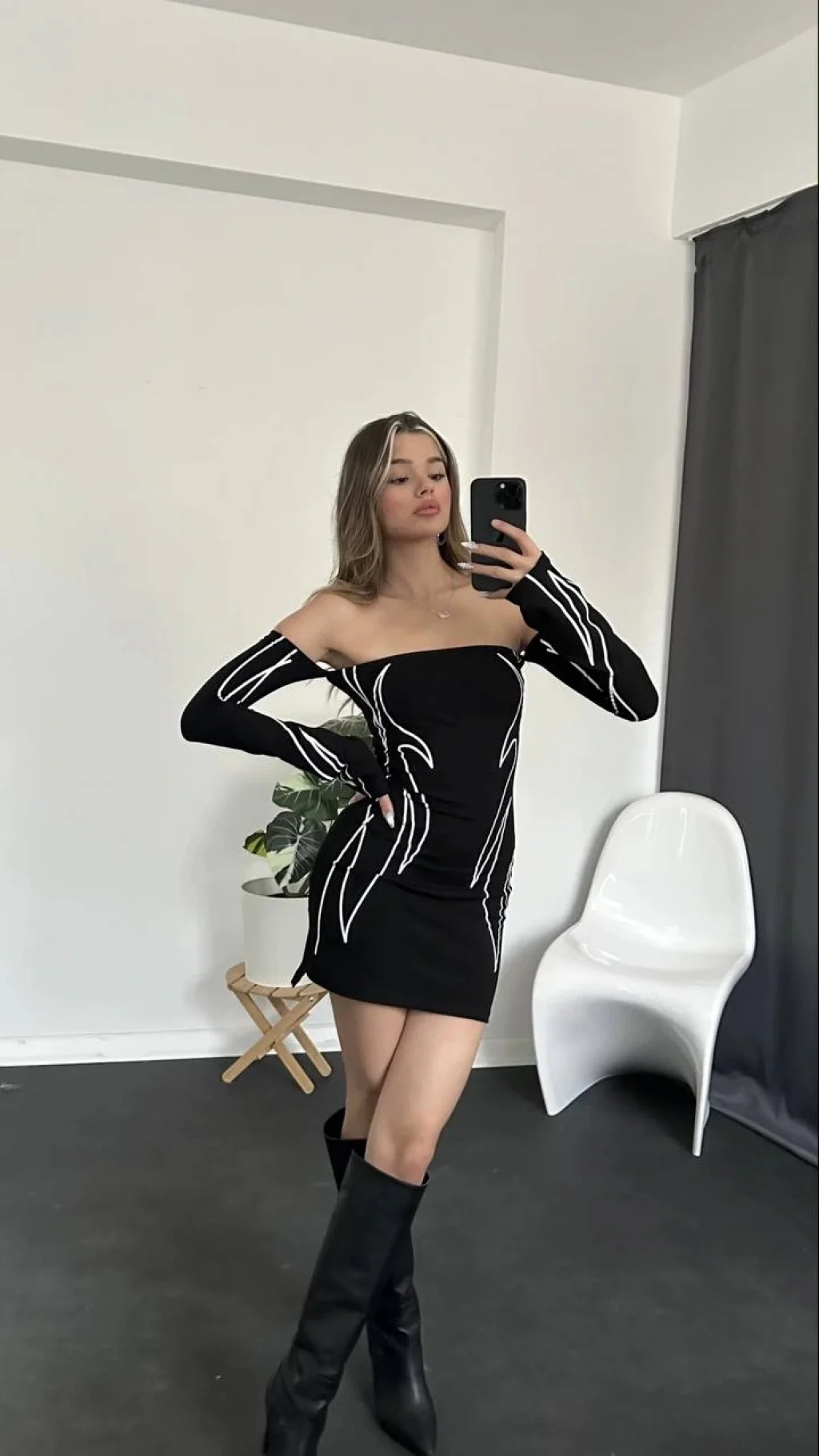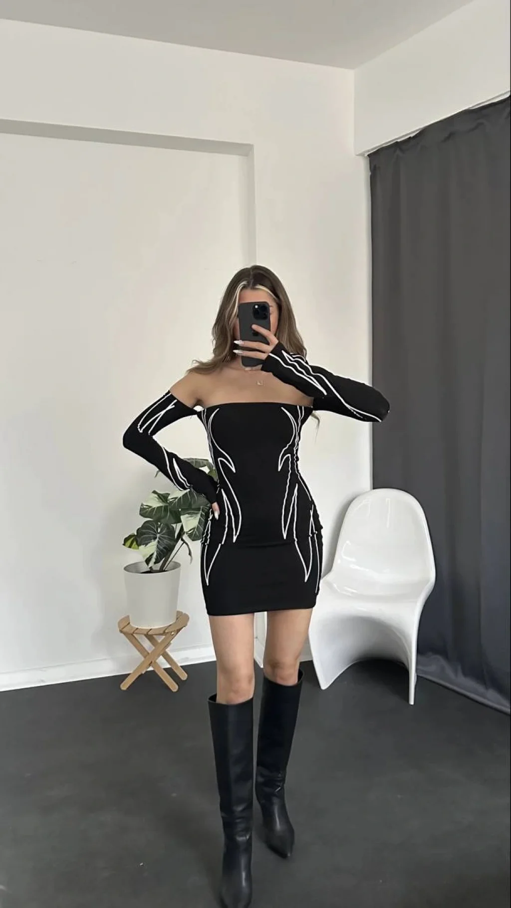 Bu siyah mini elbise, cesur bir stil ifadesidir. Onu uzun deri çizmeler veya platform topuklu botlarla tamamlayarak güçlü ve iddialı bir görünüm yaratabilirsiniz. Daha klasik bir şıklık için ise ince bantlı stiletto'lar ve minimalist bir clutch çanta yeterli olacaktır.