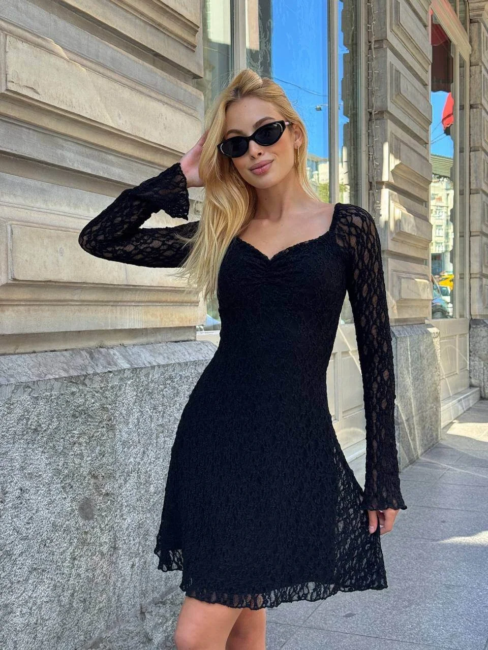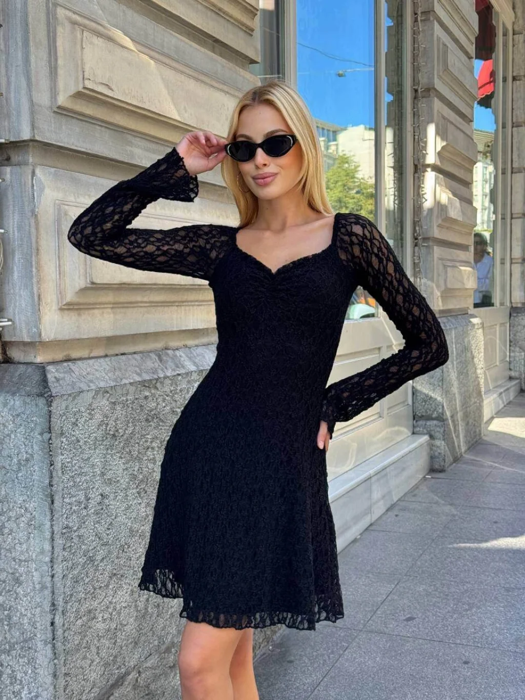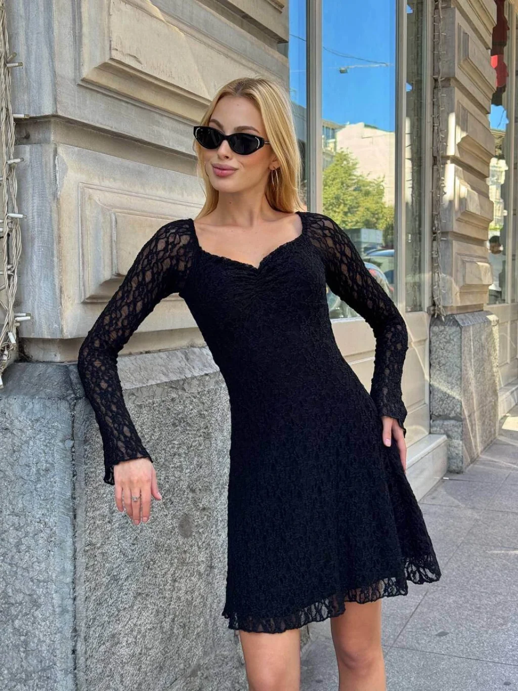 Zarafetin ve romantizmin en saf hali... Kalp Yaka Dantel Mini Elbise, özel anlarınıza eşlik etmek ve sizi masalsı bir görünüme kavuşturmak için tasarlandı. Her detayıyla feminen bir duruş sergileyen bu parça, gardırobunuzun en özel köşesini hak ediyor.