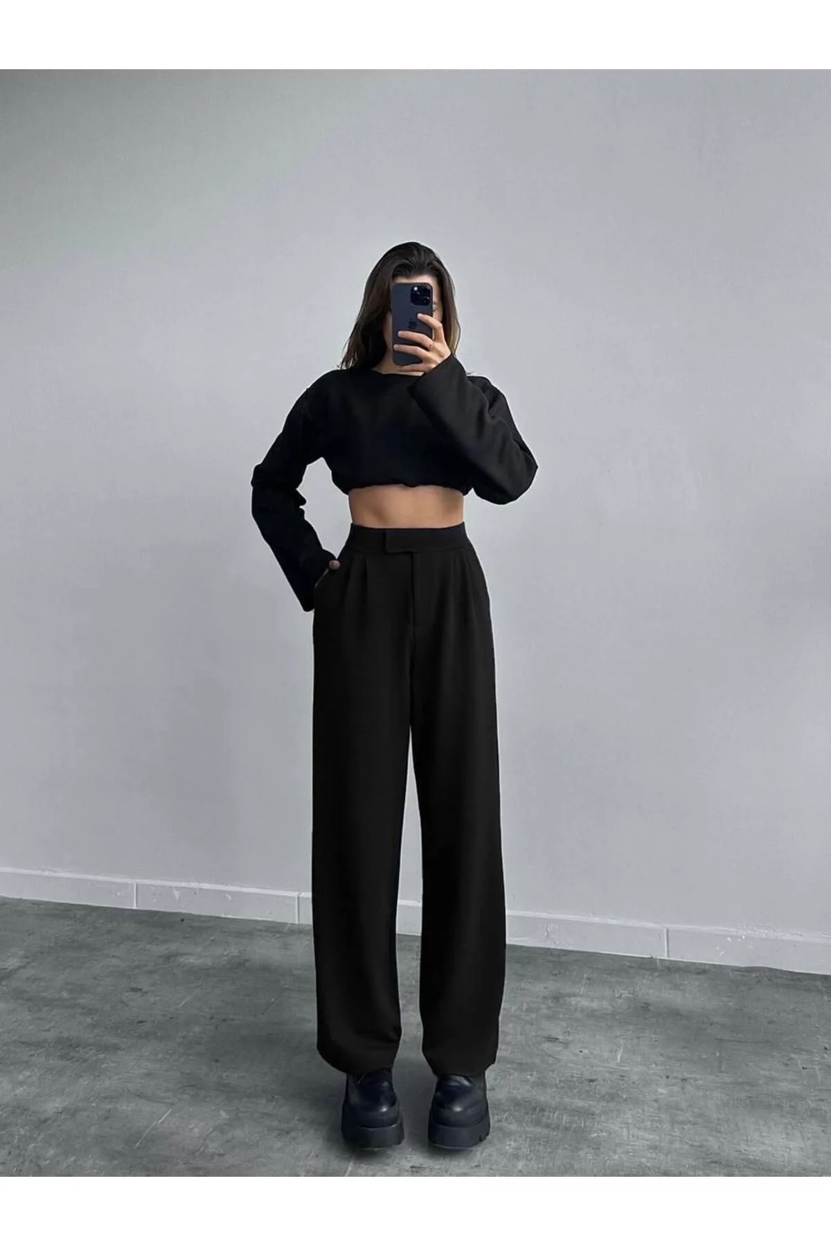 Kadın Siyah Yüksek Bel Cırtlı Pileli Bol Paça Palazzo Model Kumaş Pantolon