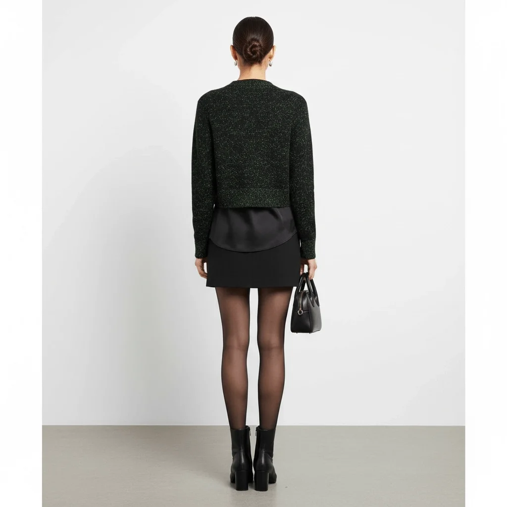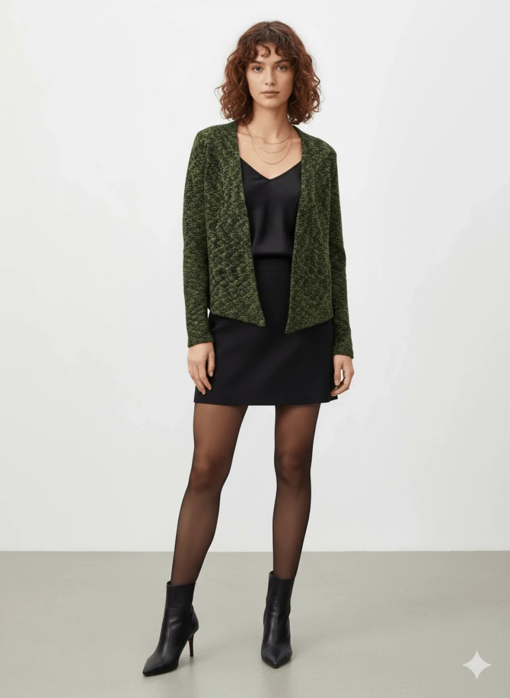 Ofis şıklığından günlük kombinlere kadar geniş bir kullanım alanı sunan bu yeşil triko ceket, gardırobunuzun en fonksiyonel parçalarından biri olacak. Onu mini bir etek ve opak çoraplarla klasik bir görünüme kavuşturabilir, bir kumaş pantolonla ofise taşıyabilir veya bir jean ile hafta sonu şıklığınıza dahil edebilirsiniz.