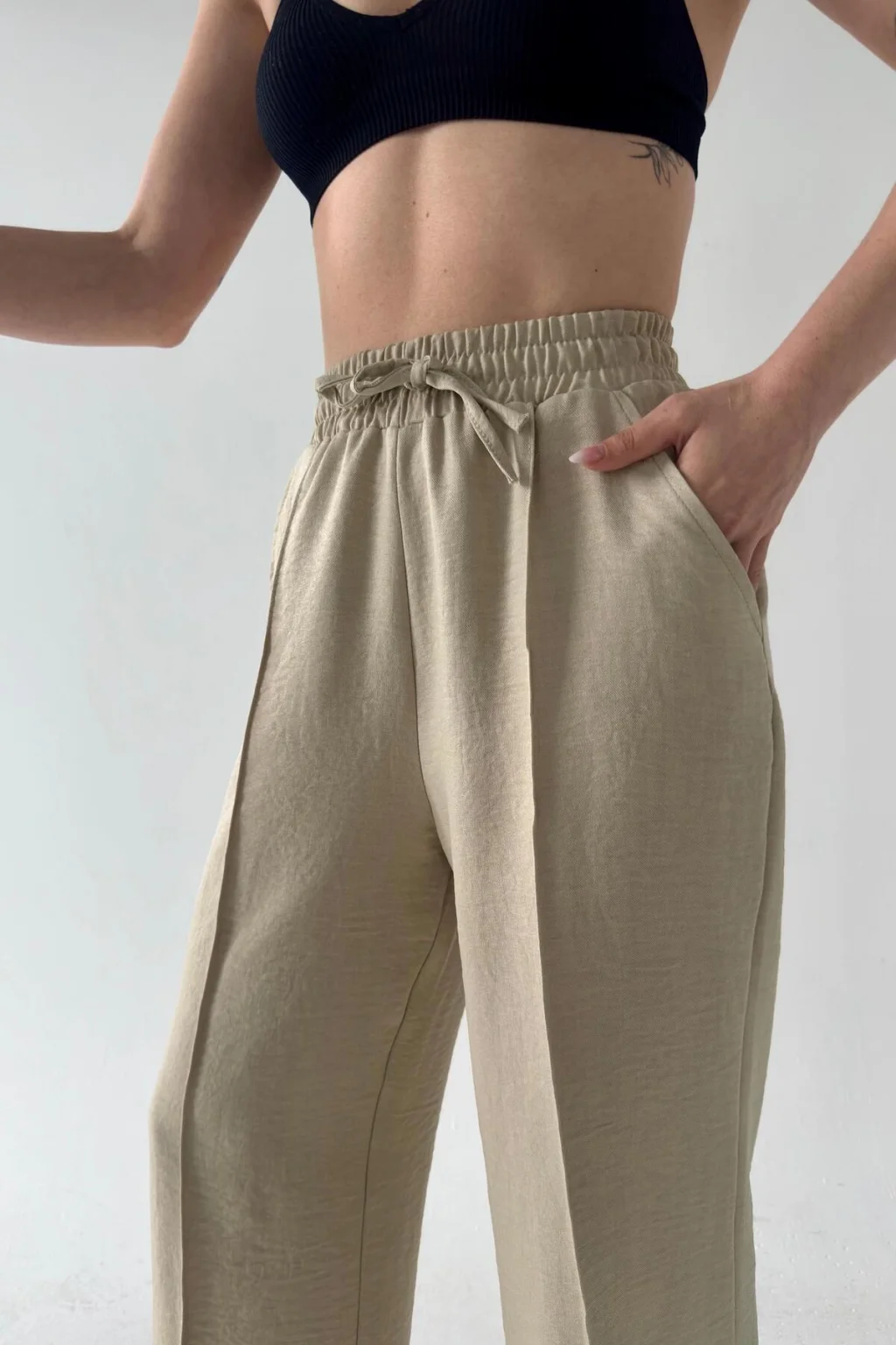 Bu bej keten pantolon, sonsuz kombin imkanı sunar. Beyaz veya siyah bir crop top ile tamamlayarak modern ve sade bir görünüm elde edebilirsiniz. Toprak tonlarındaki (haki, kahve, krem) parçalarla harika bir uyum yakalar. Hasır bir çanta ve sandaletlerle tamamlayarak tatil şıklığınızı bir üst seviyeye taşıyın.