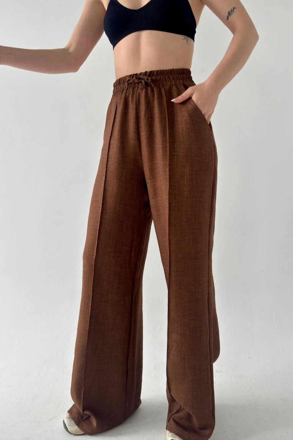 Bu kahverengi keten pantolon, bohem ve sofistike bir stilin anahtarıdır. Onu ekru veya krem rengi bir crop top ve hasır sandaletlerle tamamlayarak doğal bir şıklık yakalayabilirsiniz. Siyah ipek bir askılı ve altın rengi takılarla yaz akşamları için zarif bir alternatif oluşturabilirsiniz.