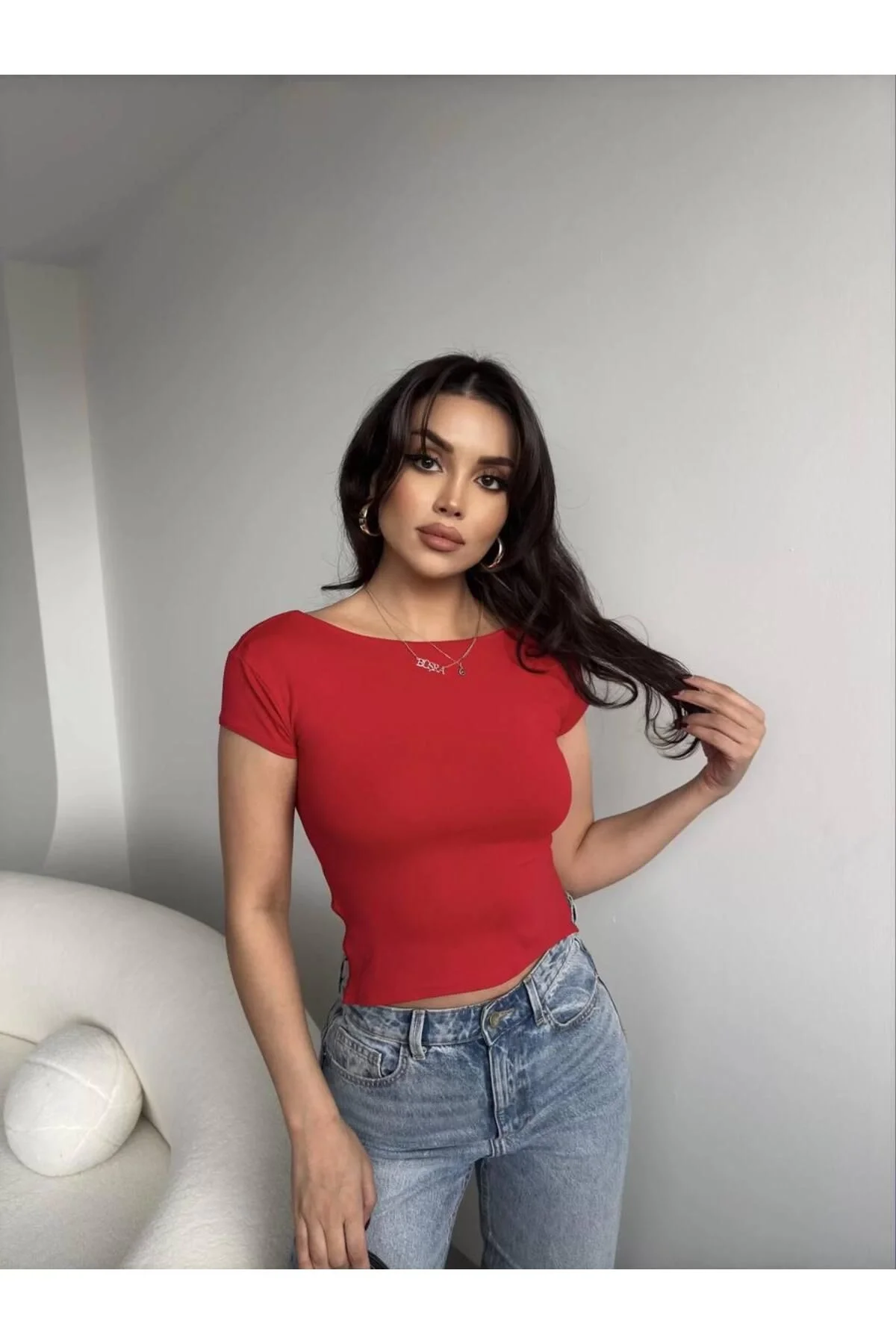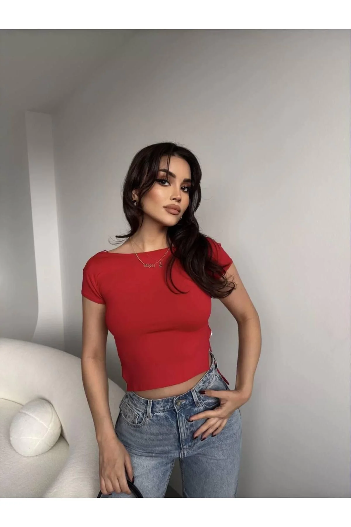 Kadın Kayık Yaka Sırtı Açık İp Bağlamalı Kısa Kollu Vücudu Saran Crop Bluz - Kırmızı