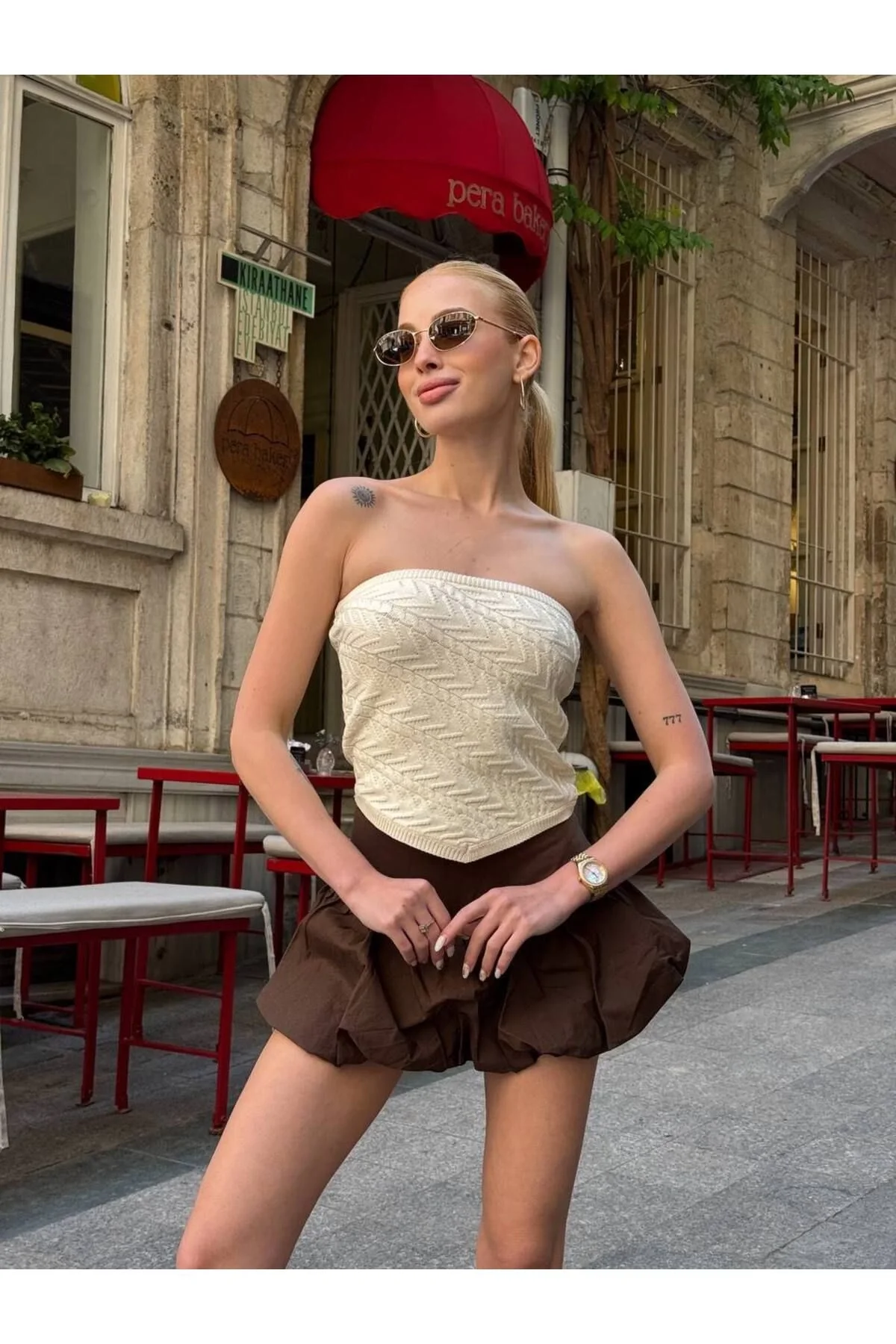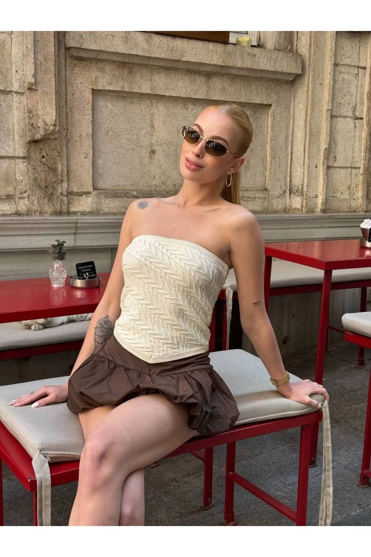 Yaz sezonunun favorisi olmaya aday bu kahverengi straplez triko büstiyer ile hem rahatlığı hem de şıklığı bir arada yaşayacaksınız Esnek yapısı sayesinde vücuda tam oturur Desenli dokusu ile sade kombinlere hareket katar Yumuşak triko kumaşı sayesinde gün boyu konfor sunar Yüksek bel şort, etek ya da pantolonlarla mükemmel uyum sağlar Serin yaz akşamlarında ceketlerle de kolayca kombinlenebilir Hem günlük kullanıma hem de özel gün kombinlerine uygundur