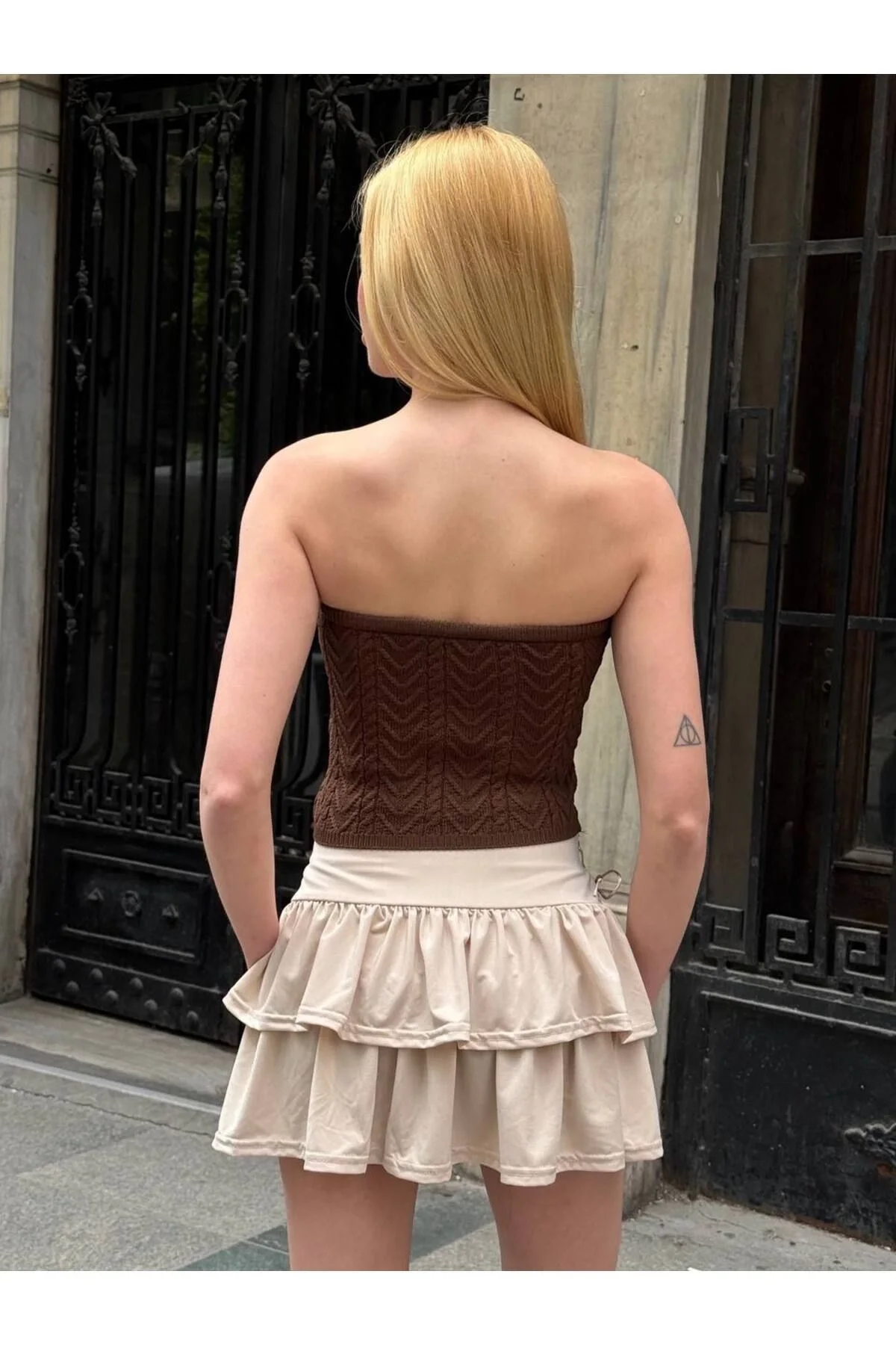 Kadın Straplez Asimetrik Kesim Örgü Desenli Triko Crop Büstiyer Top - Kahverengi