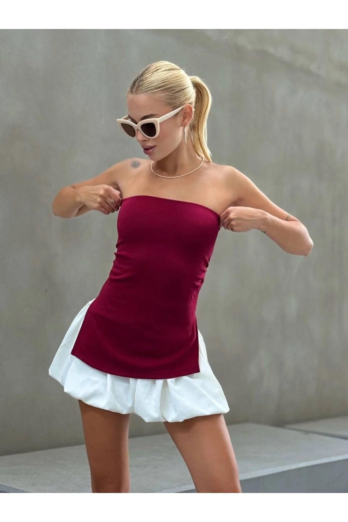 Kadın Straplez Yanları Büzgülü Yırtmaçlı Vücudu Saran Kaşkorse Bluz - Bordo