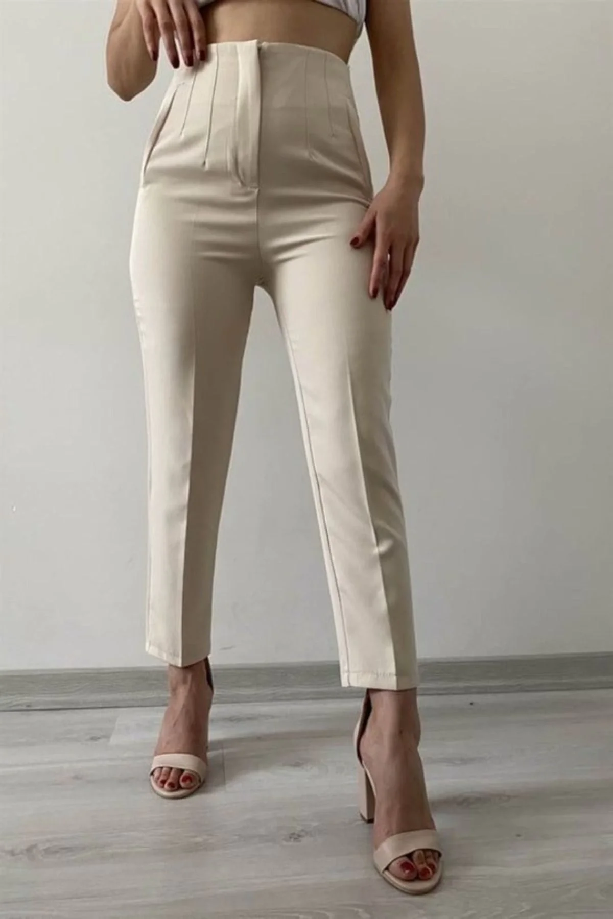 Kadın Yüksek Bel Önü Çift Pileli Cepli Kemer Köprülü Keten Kumaş Pantolon - Krem